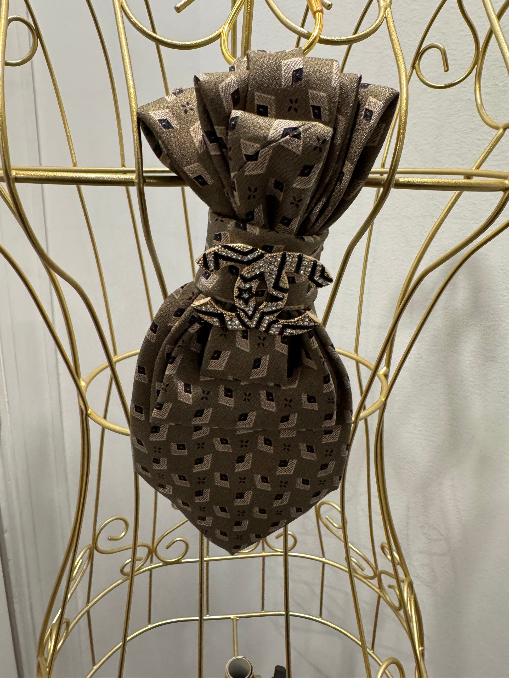 Tan printed tie with zebra stripe bling brooch no necklace added